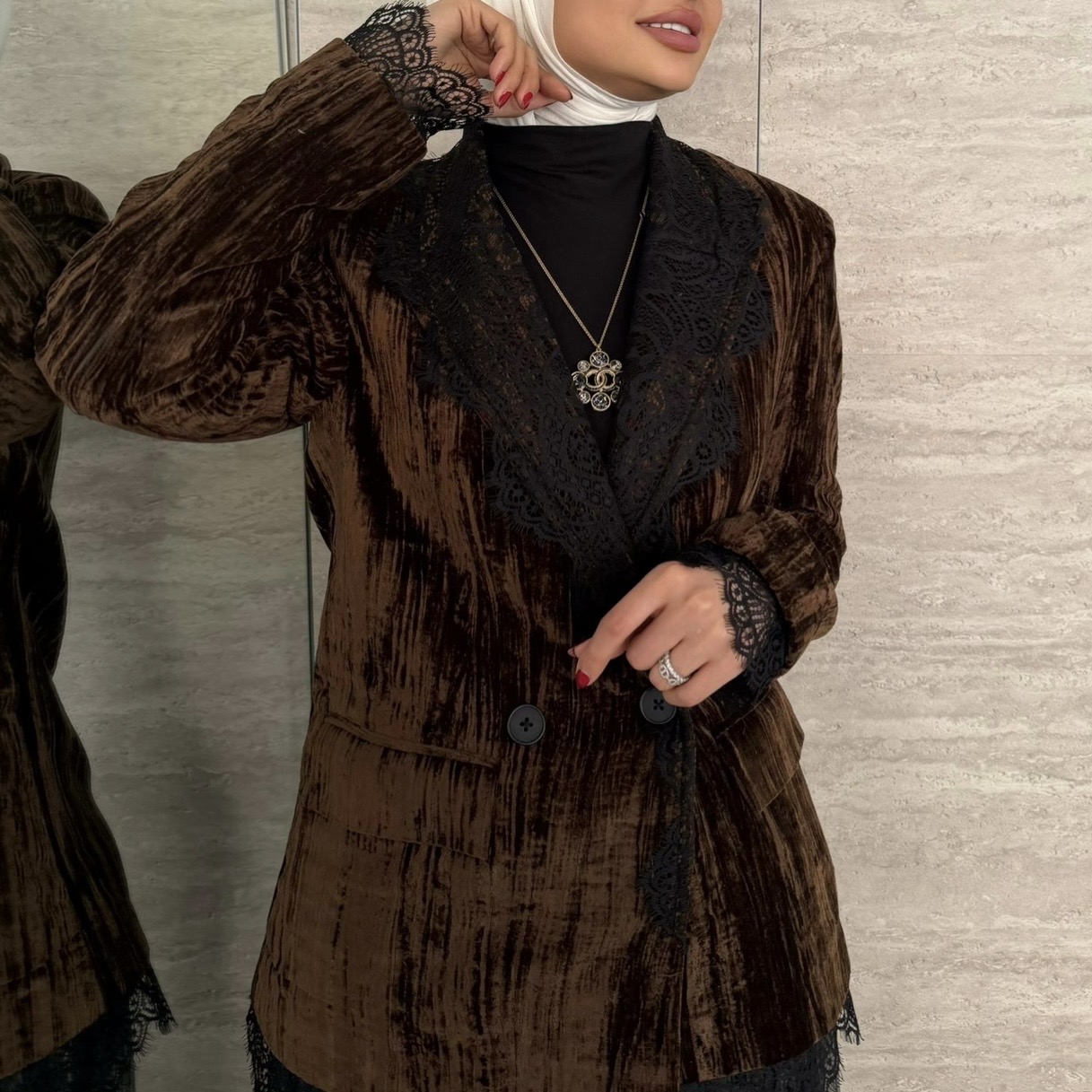 Velvet set with Lace details in Brown color